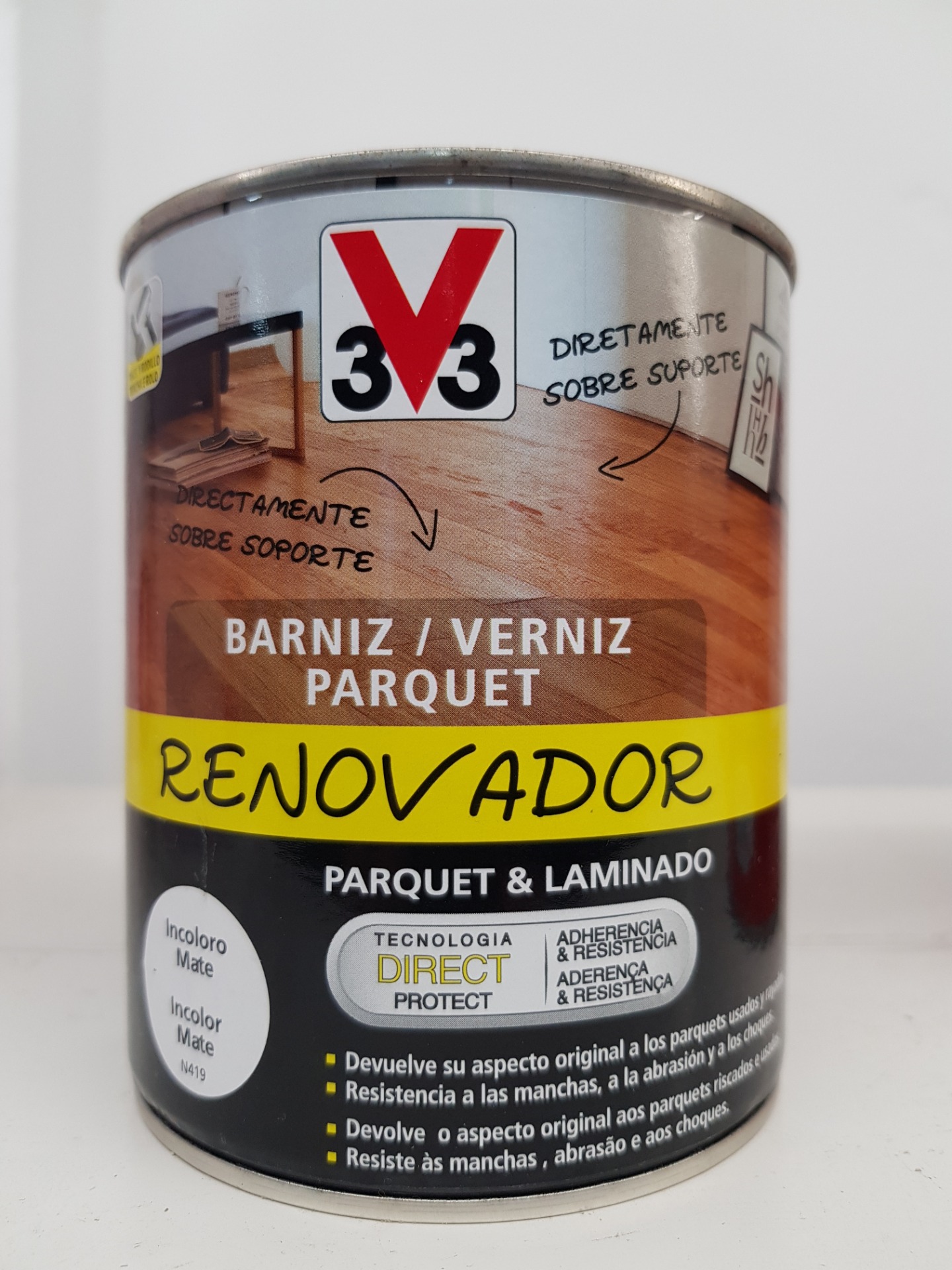 V33 - Barniz Parquet Renovador. Barniz para parquet al agua, muy resistente, con acabado mate o satinado. En envases de 750ml o 2.5lt. Precio 750ml 16.09€, precio 2.5lts 43.00€. (10% descuento aplicado en precio)
